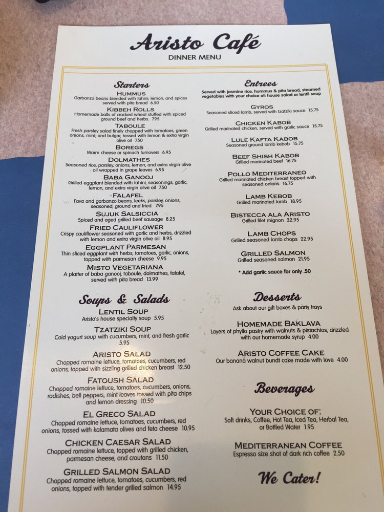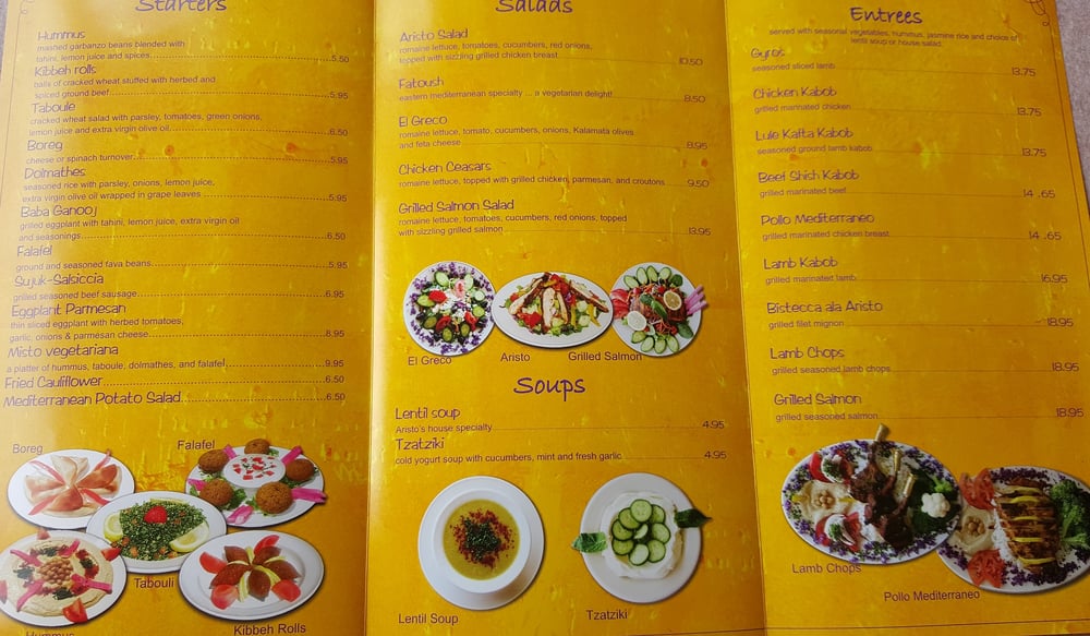 Start with the Aristo Salad, a house specialty that has won hearts for over 25 years. It's a refreshing blend of romaine, tomatoes, and grilled chicken, paired with their signature balsamic dressing. For a heartier meal, try the Gyros Dinner Entree, featuring seasoned lamb on jasmine rice accompanied by fresh hummus and tzatziki sauce.