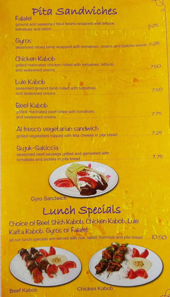 Seasoned sliced lamb.Gyros lunch specials are served with 4 delicious slices of gyros per plate atop fresh Jasmin rice, our house salad(dressing on the side), hummus & pita bread.And freshly made 2oz. tzatziki sauce